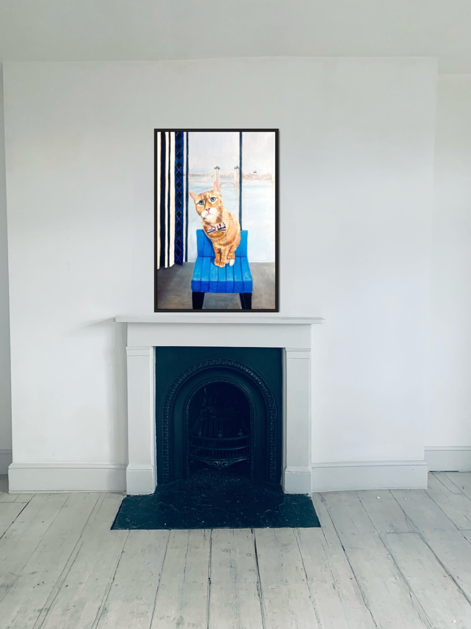 In the utmost grandeur of visual artistry, my latest tableau, whimsically entitled "Yogurt," exudes an irresistible fusion of surrealism and realism. The primary subject is a felis catus, rendered with an acute veracity that all but breathes life into the canvas, gazing directly at the viewer with eyes brimming with an almost palpable contentment. The residence from which Yogurt gazes upon its owner is depicted with a comforting familiarity. An intoxicating juxtaposition forms the backdrop, presenting a marvellously monochromatic panoramic view of the architectural marvel that is the Tower Bridge, sketched against the vast expanse of the London skyline. The contrast between the minutiae of the cat's expression and the grandiosity of the cityscape evokes a profound sense of paradox, a delightful conundrum for the observer. Yogurt seems utterly unaffected by the iconic scenery unfolding behind him, reinforcing the simple, homely happiness derived from the loving gaze of his owner. A more poignant testament to both the ordinary and extraordinary facets of life one could hardly fathom.